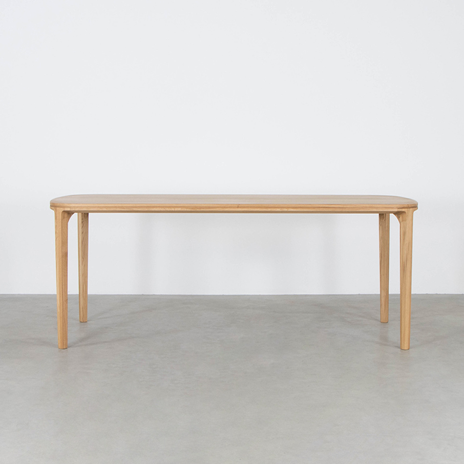 De Onni is een minimalistische en verfijnde massief houten tafel waarbij de vijfhoekige poten ogenschijnlijk doorlopen in het tafelblad. Het blad van de Onni tafel heeft een zacht en rond verloop.