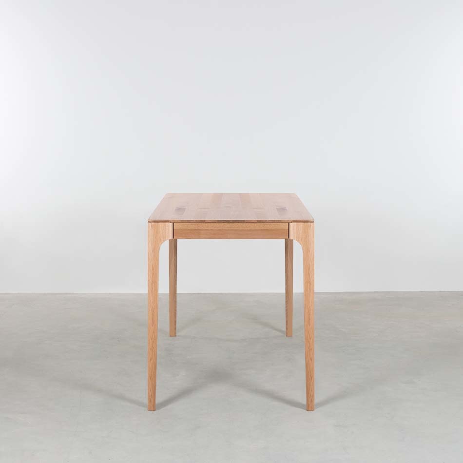 Het Rikke bureau is een bureau waarbij design en functionaliteit goed samen gaan. Het bureau heeft ronde vormen en evenals de eetkamertafel een lichte uitstraling. Doordat de poten van de Rikke op de hoek zijn geplaatst biedt de tafel veel ruimte. Heel subtiel gaan de poten over in het blad. Op deze manier houd je de werkplek lekker ruim en kun je deze optimaal benutten. Met het Rikke bureau haal je een bureau in huis wat voordelig omgaat met de beschikbare ruimte.