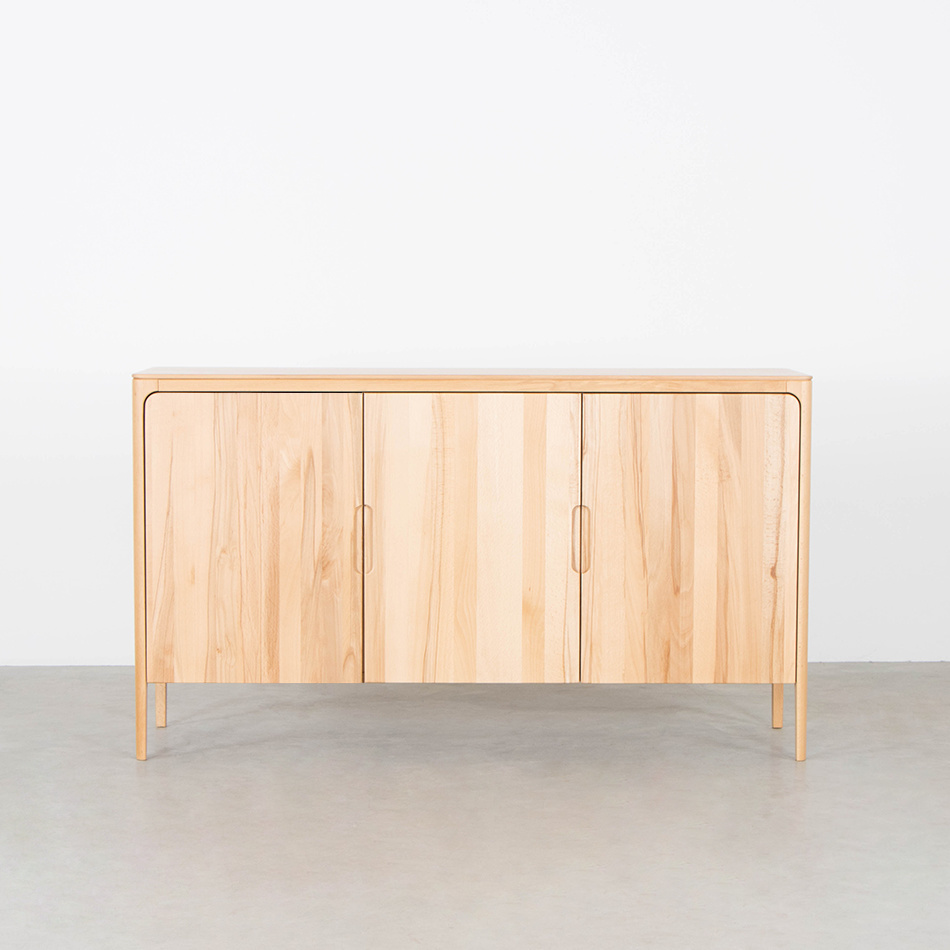 Ben jij op zoek naar een bijzondere beuken kast? De Rikke kast heeft dezelfde ronde hoeken als de Rikke tafel, eettafelbankje en het dressoir. Het is een massief houten kast met een Scandinavisch ontwerp. De poten vormen één vloeiend geheel met de rest van de kast. De lijnen in het hout lopen op de deurtjes door en halen zo het natuurlijke lijnenspel je huiskamer in. De highboard kast is er met twee of drie deuren. Hij is leverbaar in beuken, eiken en walnoot hout. De deuren kunnen ook in gekleurd Fenix gemaakt worden. Zo is er altijd een Rikke kast verkrijgbaar dat bij jouw interieur past.