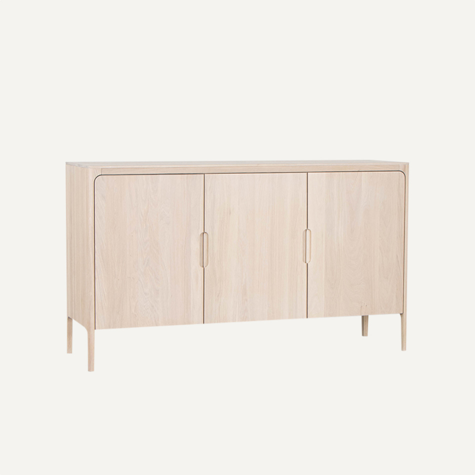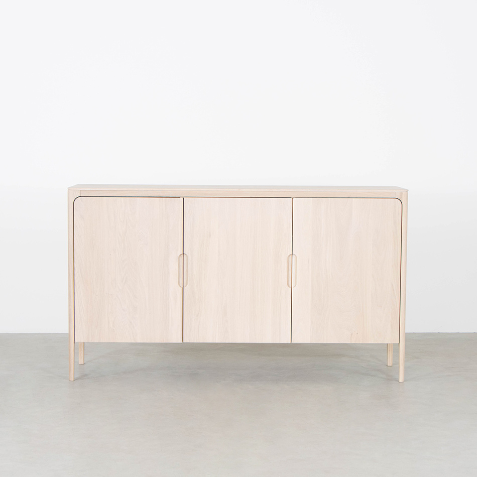 Ben jij op zoek naar een bijzondere eiken whitewash kast? De Rikke kast heeft dezelfde ronde hoeken als de Rikke tafel, eettafelbankje en het dressoir. Het is een massief houten kast met een Scandinavisch ontwerp. De poten vormen één vloeiend geheel met de rest van de kast. De lijnen in het hout lopen op de deurtjes door en halen zo het natuurlijke lijnenspel je huiskamer in. De highboard kast is er met twee of drie deuren. Hij is leverbaar in beuken, eiken en walnoot hout. De deuren kunnen ook in gekleurd Fenix gemaakt worden. Zo is er altijd een Rikke kast verkrijgbaar dat bij jouw interieur past.