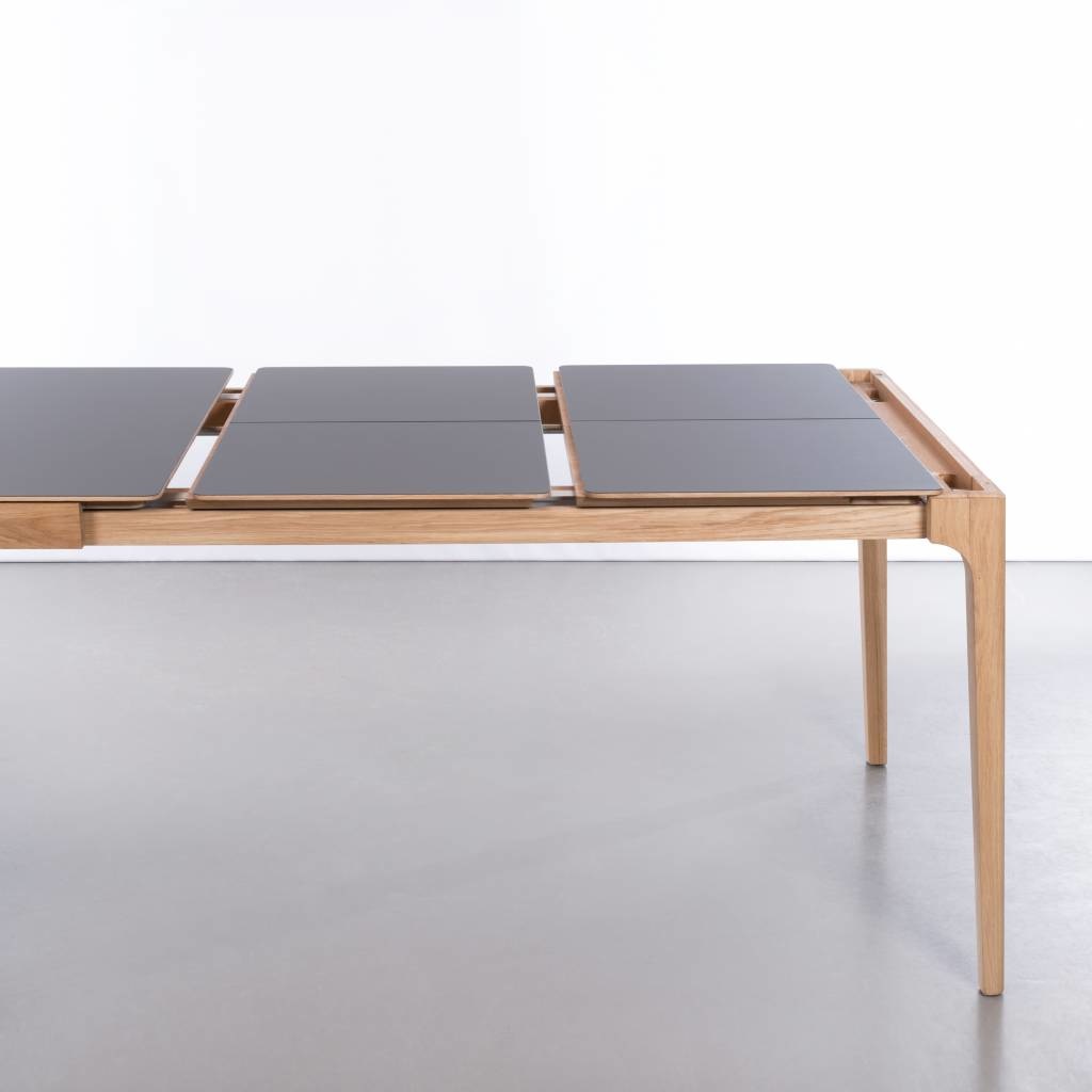 De uitschuifbladen van de tafel hangen onder het tafelblad. Ze hangen hierbij enigszins schuin. Bij een massief houten tafel loopt de lijntekening van het hout niet door bij het uitgeschoven deel van de tafel. Kom eens langs in één van de showrooms om de uitschuifbare tafel te bekijken en de mogelijkheden met ons te bespreken.