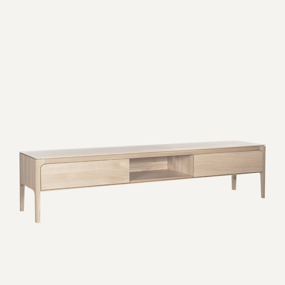 Met een TV-meubel (ook wel mediameubel of TV-kast genoemd) maak je een einde aan al die kabels in je woonkamer. Het meubel ondersteunt je TV en zorgt ervoor dat al jouw media-apparatuur en bijbehorende kabels gemakkelijk kunnen worden opgeborgen. Het Rikke TV-meubel van ons merk Sav&Økse is een houten TV-meubel in Scandinavische stijl, waarbij design en functionaliteit goed samen gaat. Het Rikke TV-meubel geeft je televisie en audioapparatuur een stevige Scandinavische basis om op te staan.