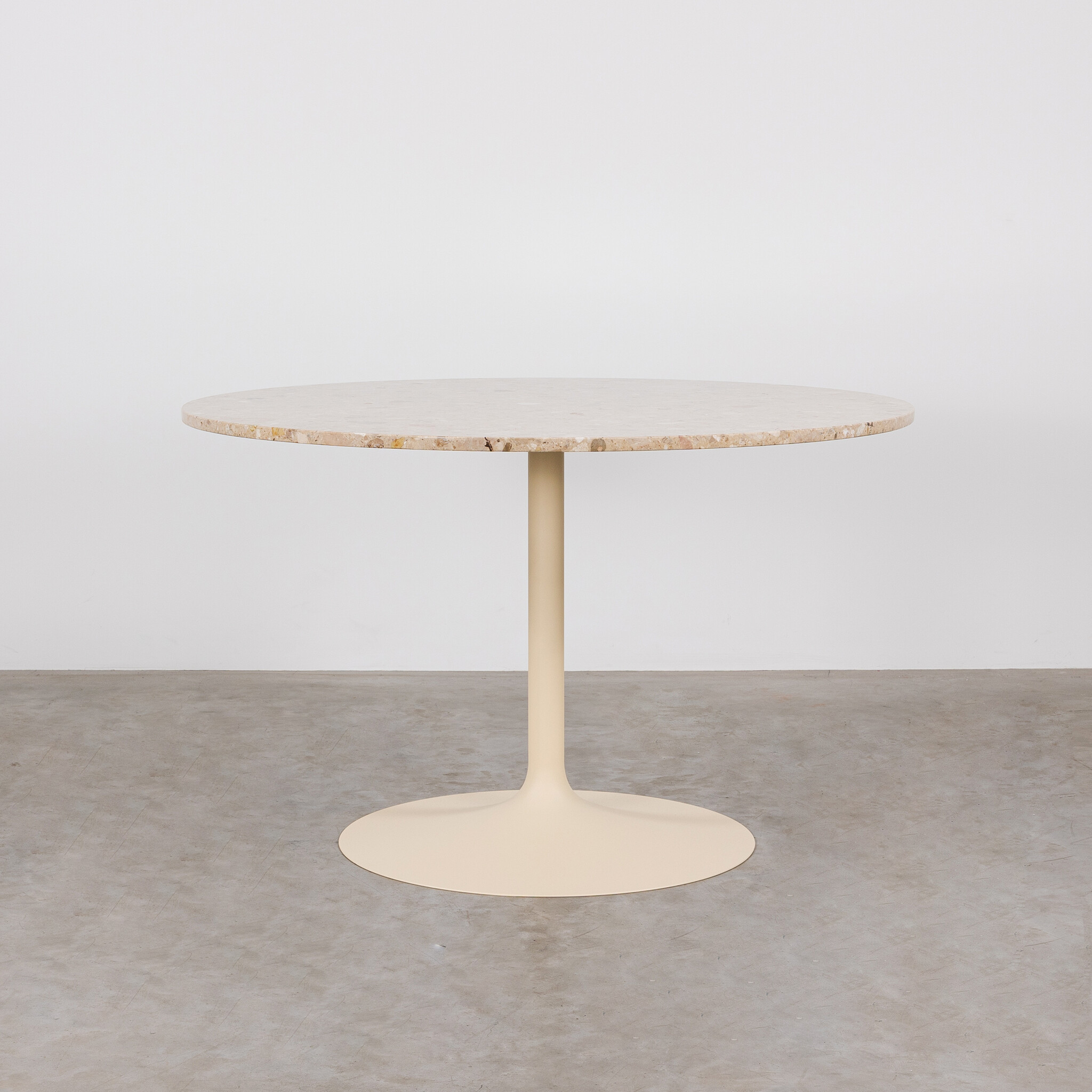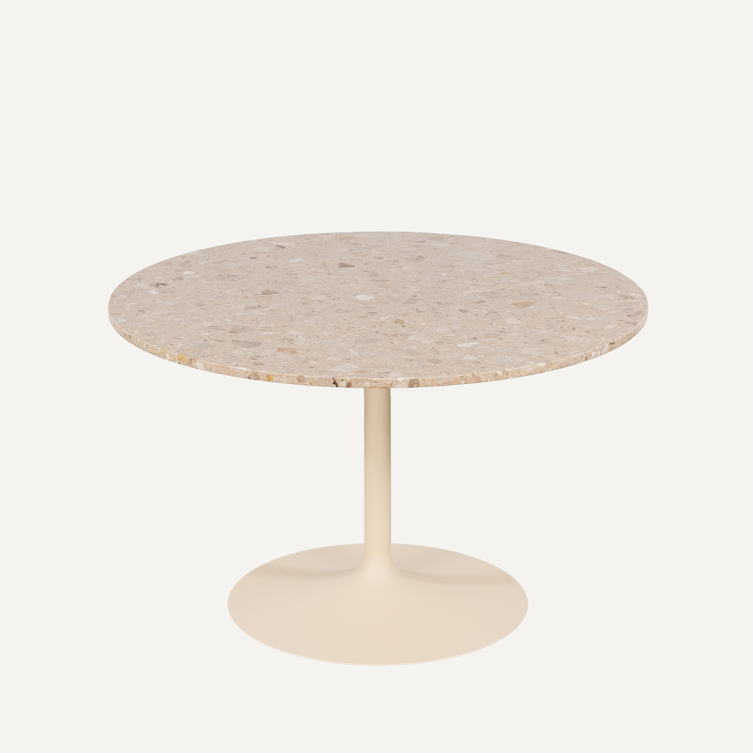 Tafel Tinne combineert moderne elegantie met functionaliteit. Het is een stijlvolle en stevige ronde eettafel. Het marmercomposiet blad straalt luxe uit en is toch praktisch in onderhoud. De elegante trompetvoet geeft de tafel een eigentijdse uitstraling en biedt uitstekende stabiliteit. De poot en het blad zijn verkrijgbaar in verschillende kleuren, zodat er altijd een variant is die perfect bij jouw stijl past.