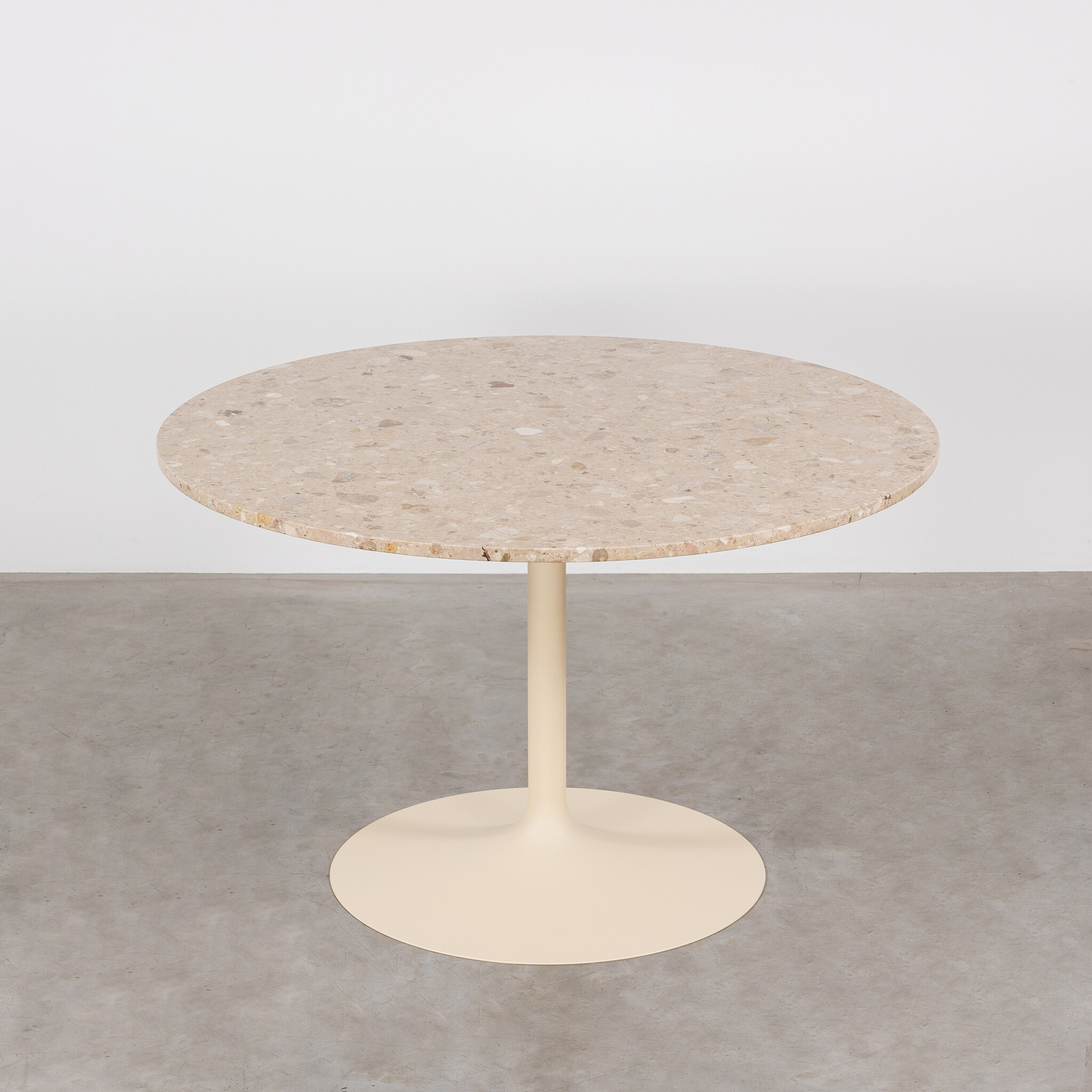 Het tafelblad van marmercomposiet is verkrijgbaar in diverse kleuren. Het ronde blad heeft een diameter van 120 cm, wat zorgt voor voldoende ruimte voor maaltijden, werk of ontspanning.