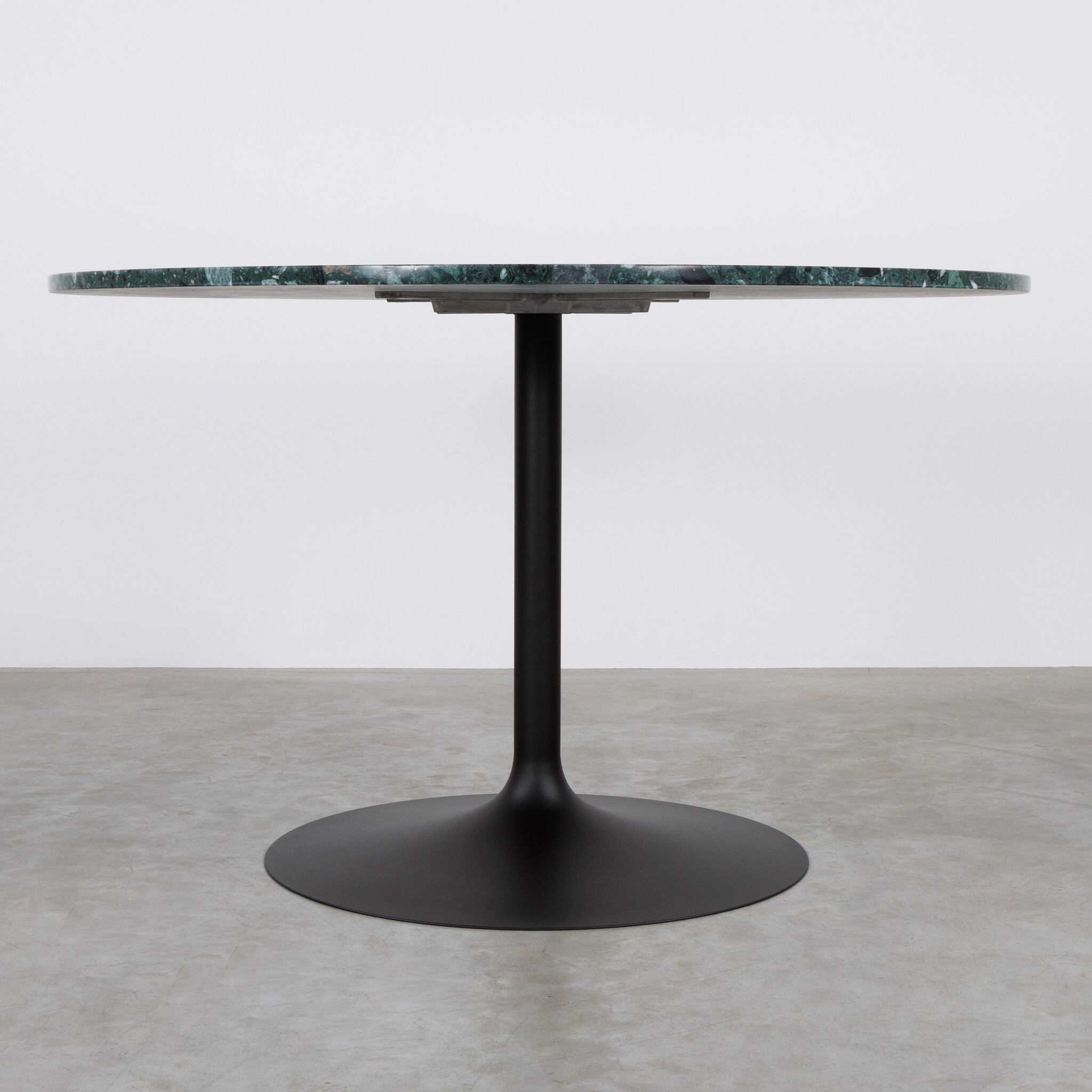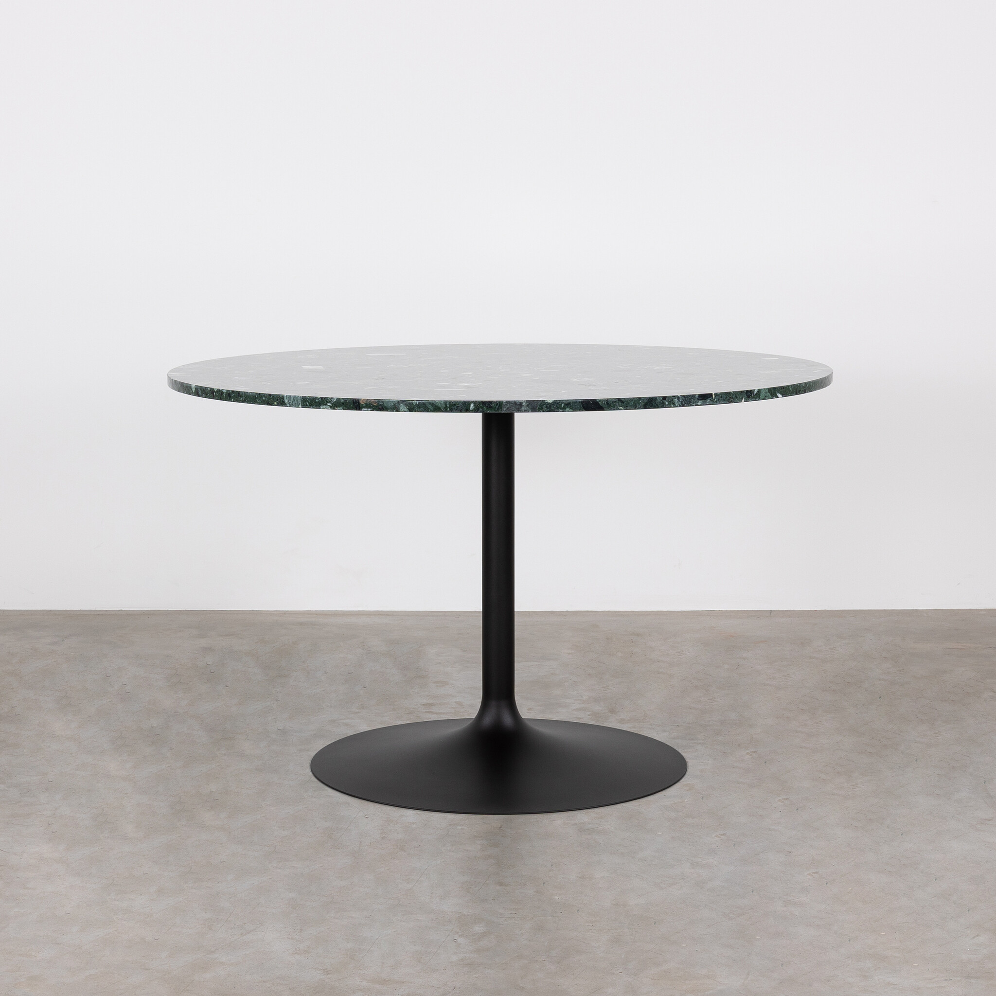 Het tafelblad van marmercomposiet is verkrijgbaar in diverse kleuren. Het ronde blad heeft een diameter van 120 cm, wat zorgt voor voldoende ruimte voor maaltijden, werk of ontspanning.