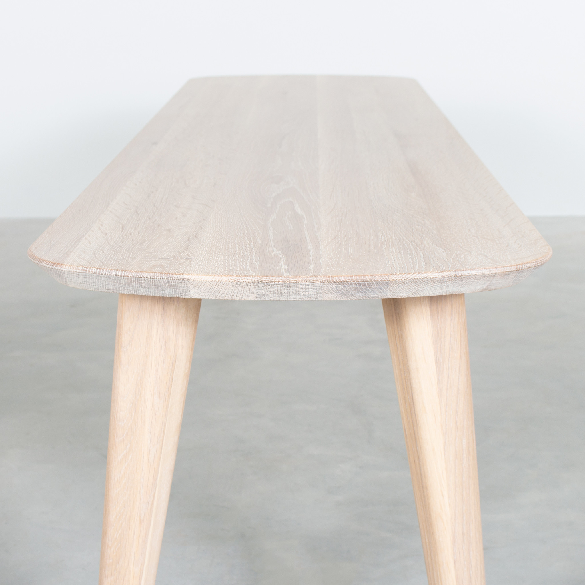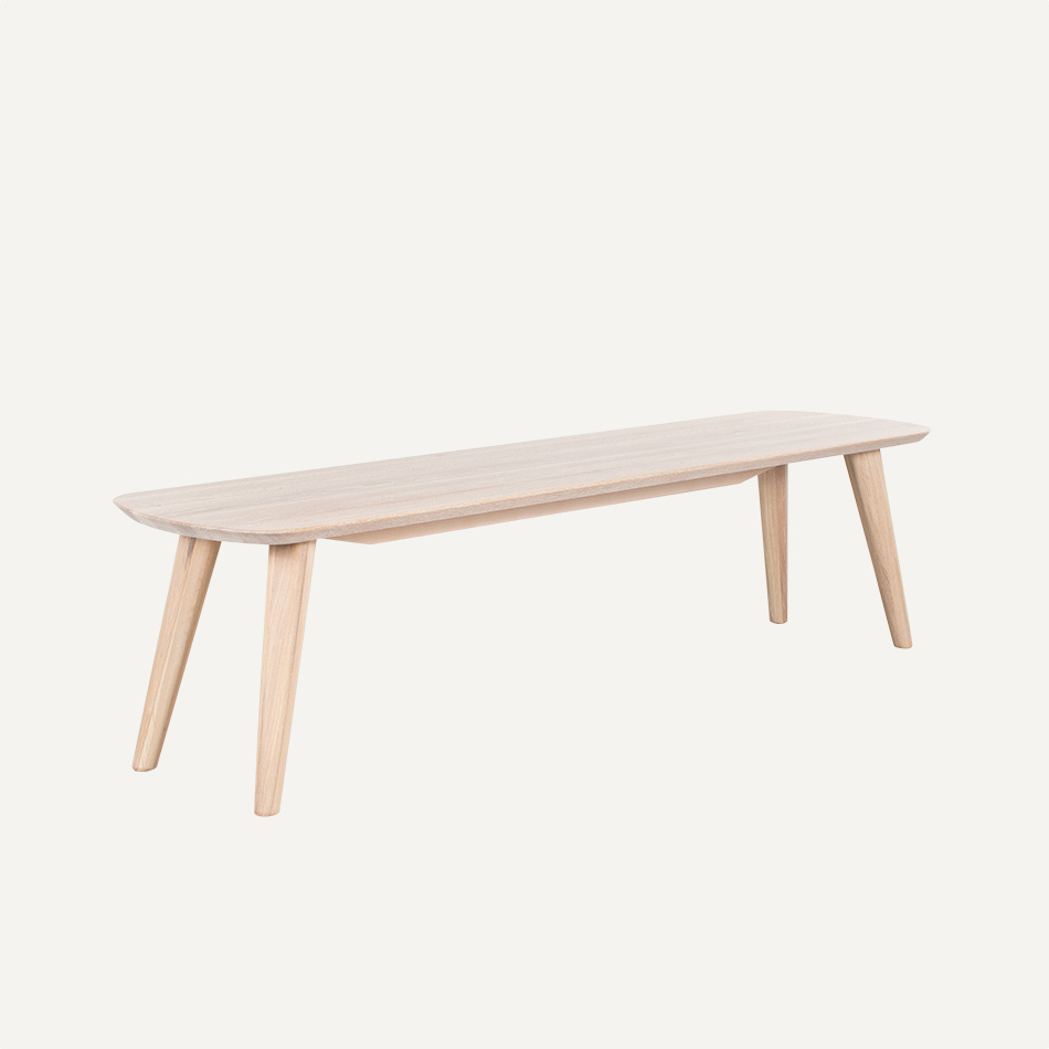 De Tomrer is een massief houten bankje in de Deense stijl van de jaren ’60. Een retro bankje met een frisse uitstraling. De combinatie van de ranke constructie met het slanke blad geeft deze bank een licht en zachte uitstraling. Het blad is aan de kopse kant rond en is aan de randen verjongd. De poten staan iets schuin onder het blad en hebben afgeronde hoeken. Geen scherpe randen of hoeken aan deze bank.