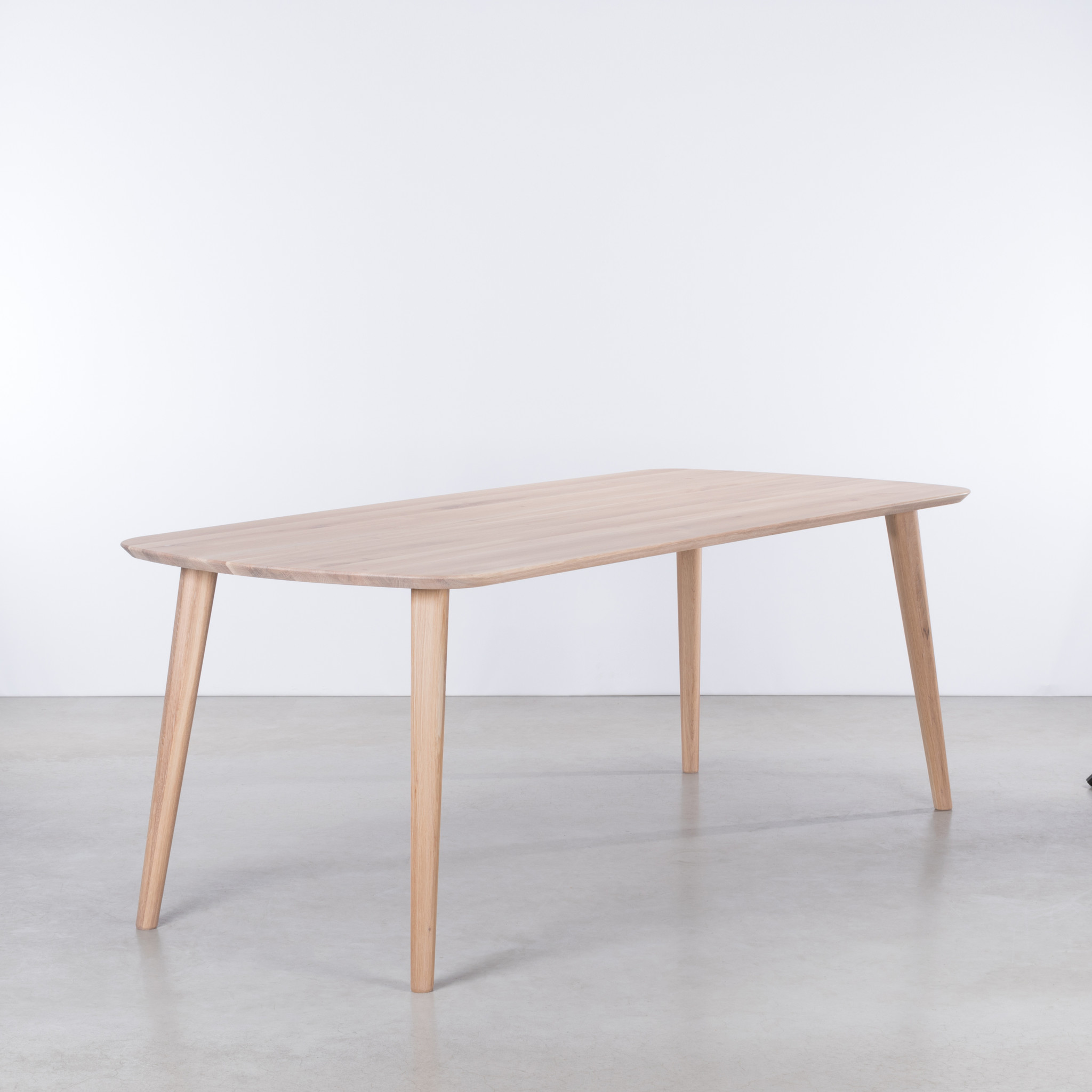 De Tomrer is een massief houten tafel in de Deense stijl van de jaren ’60. Een retro tafel met een frisse uitstraling. De combinatie van de ranke constructie met het slanke blad geeft deze eettafel een licht en zachte uitstraling. Het tafelblad is aan de kopse kant rond en is aan de randen verjongd. De tafelpoten staan iets schuin onder het blad en hebben afgeronde hoeken. Geen scherpe randen of hoeken aan deze tafel.